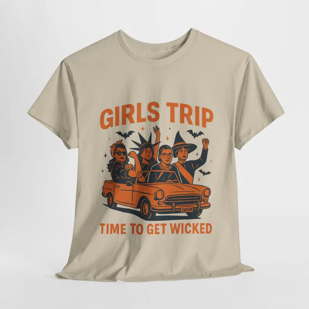 Grab your coven and hit the road — this “Girls Trip – Time to Get Wicked” t-shirt is the ultimate Halloween adventure shirt for bold, fun-loving women. Featuring four fierce witches riding in style toward Salem, this playful design celebrates friendship, empowerment, and a little bit of spooky mischief.